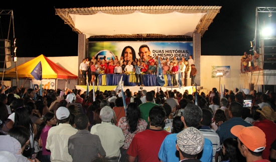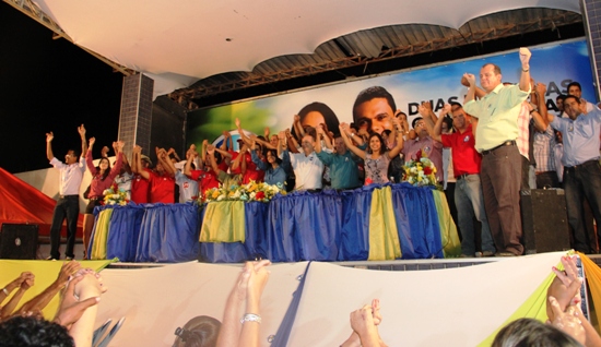 Foi montado um cenário digno de grandes festas políticas na área aberta do Clube e o palco serviu para montagem da mesa que foi formada pelos candidatos a prefeito e vice, vereadores da coligação formada por dez partidos: PSD, PT, PTC, PR, PRB, PRTB, DEM, PPL, PP e PCdoB, e terá entre 40 e 45 candidatos a vereador e lideranças da sede e zona rural do município.